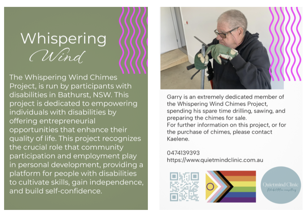 The Whispering Wind Chimes Project, run by participants with disabilities in Bathurst, NSW, is dedicated to empowering individuals with disabilities by offering entrepreneurial opportunities that enhance their quality of life. This project recognizes the crucial role that community participation and employment play in personal development, providing a platform for people with disabilities to cultivate skills, gain independence, and build self-confidence. By equipping participants with the necessary tools to thrive, Whispering Winds enables them to make meaningful contributions to their communities while achieving financial independence
